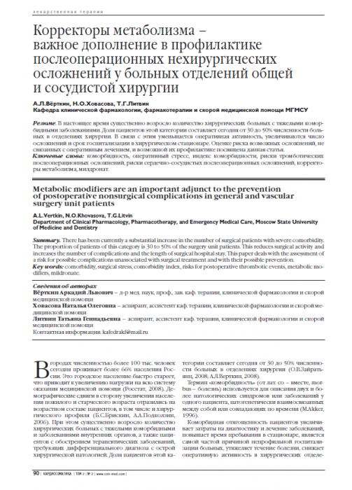 Корректоры метаболизма – важное дополнение в профилактике послеоперационных нехирургических осложнений у больных отделений общей и сосудистой хирургии - Научно-практический журнал Cardioсоматика Том 2, №2 (2011)