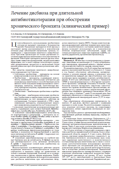 Н.А.Власова, Н.Ш.Загидуллин, Ш.З.Загидуллин, Л.П.Фаизова. Лечение дисбиоза при длительной антибиотикотерапии при обострении хронического бронхита (клинический пример). Consilium Medicum. Гастроэнтерология (Прил.). 2013; 1: 76-78.