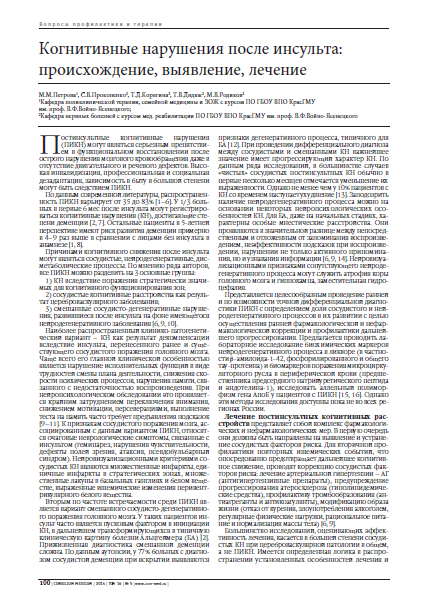 Петрова М.М., Прокопенко С.В., Корягина Т.Д., Дядюк Т.В., Родиков М.В.. Когнитивные нарушения после инсульта: происхождение, выявление, лечение. Consilium Medicum. 2014; 16 (5): 100–104.