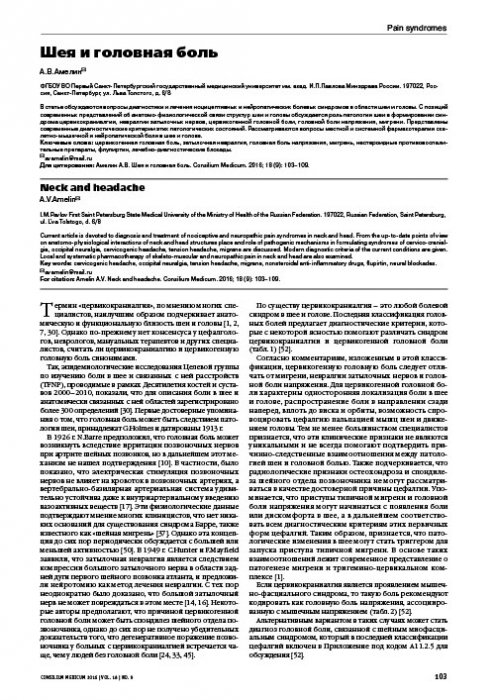 Амелин А.В. Шея и головная боль. Consilium Medicum. 2016; 18 (9): 103–109. DOI: 10.26442/2075-1753_2016.9.103-109