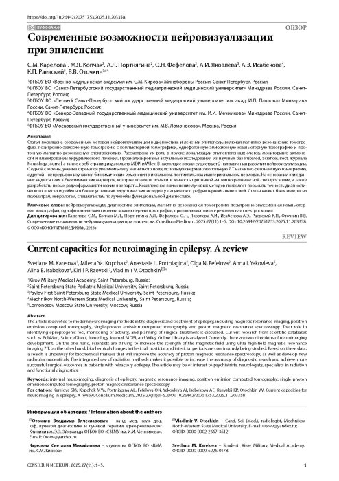 Карелова С.М., Копчак М.Я., Портнягина А.Л., Фефелова О.Н., Яковлева А.И., Исабекова А.Э., Раевский К.П., Оточкин В.В. Современные возможности нейровизуализации при эпилепсии. Consilium Medicum. 2025;27(11):1–5. DOI: 10.26442/20751753.2025.11.203358
