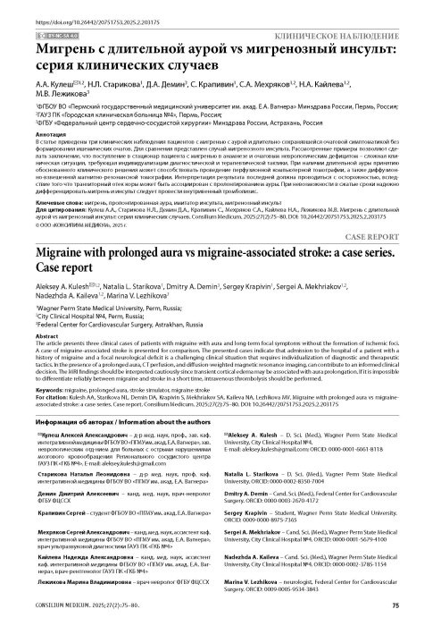 Кулеш А.А., Старикова Н.Л., Демин Д.А., Крапивин С., Мехряков С.А., Кайлева Н.А., Лежикова М.В. Мигрень с длительной аурой vs мигренозный инсульт: серия клинических случаев. Consilium Medicum. 2025;27(2):75–80. DOI: 10.26442/20751753.2025.2.203175