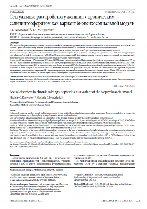 Коновалов В.Г., Менделевич В.Д. Сексуальные расстройства у женщин с хроническим сальпингоофоритом как вариант биопсихосоциальной модели. Гинекология. 2021;23(6):571–577.