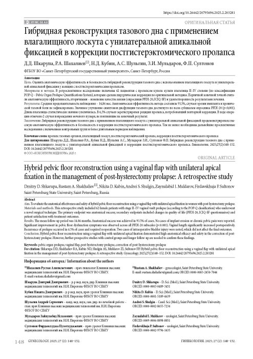 Шкарупа Д.Д., Шахалиев Р.А., Кубин Н.Д., Шульгин А.С., Мульдаров З.И., Султонов Ф.П. Гибридная реконструкция тазового дна с применением влагалищного лоскута с унилатеральной апикальной фиксацией в коррекции постгистерэктомического пролапса. Гинекология. 2025;27(2):148–152. DOI: 10.26442/20795696.2025.2.203281