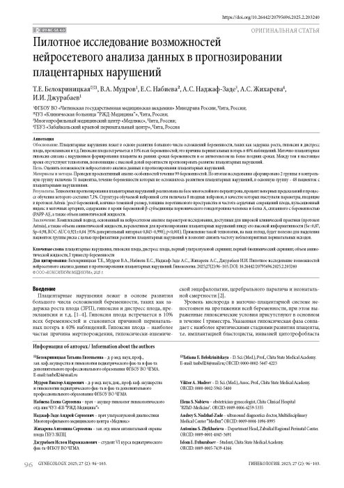 Белокриницкая Т.Е., Мудров В.А., Набиева Е.С., Наджаф-Заде А.С., Жихарева А.С., Джурабаев И.И. Пилотное исследование возможностей нейросетевого анализа данных в прогнозировании плацентарных нарушений. Гинекология. 2025;27(2):96–103. DOI: 10.26442/20795696.2025.2.203240