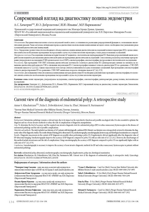 Хачатрян А.С., Доброхотова Ю.Э., Ильина И.Ю., Нариманова М.Р. Современный взгляд на диагностику полипа эндометрия. Гинекология. 2025;27(2):134–138. DOI: 10.26442/20795696.2025.2.203258