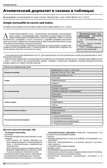 Атопический дерматит в схемах и таблицах. Педиатрия (Прил. к журн. Consilium Medicum). 2017; 1: 98–102.