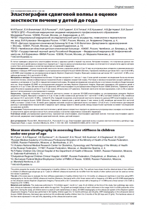 Пыков М.И., Филиппова Е.А., Рычкова В.Э. и др. Эластография сдвиговой волны в оценке жесткости печени у детей до года. Педиатрия (Прил. к журн. Consilium Medicum). 2018; 1: 135–140. DOI: 10.26442/2413-8460_2018.1.135-140