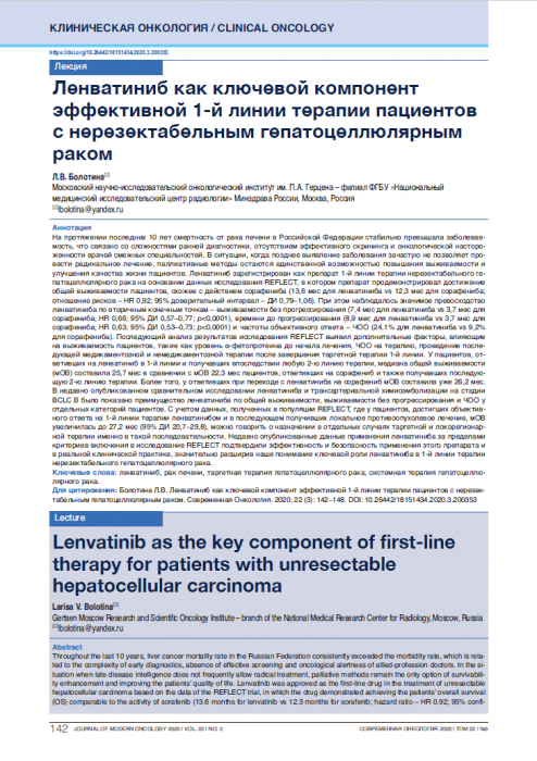 Болотина Л.В. Ленватиниб как ключевой компонент эффективной 1-й линии терапии пациентов с нерезектабельным гепатоцеллюлярным раком. Современная Онкология. 2020; 22 (3): 142–148. DOI: 10.26442/18151434.2020.3.200353