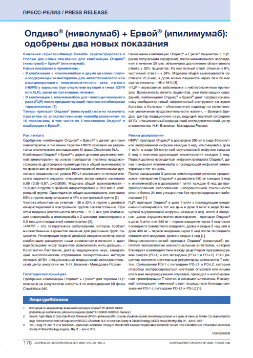 Опдиво® (ниволумаб) + Ервой® (ипилимумаб): одобрены два новых показания