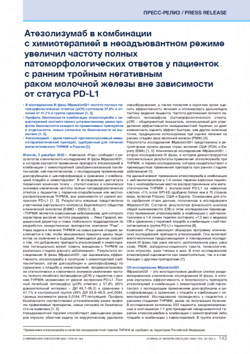 Атезолизумаб в комбинации с химиотерапией в неоадъювантном режиме увеличил частоту полных патоморфологических ответов у пациенток с ранним тройным негативным раком молочной железы вне зависимости от статуса PD-L1