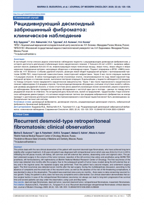 Будурова М.Д., Файнштейн И.А., Турупаев К.А. и др. Рецидивирующий десмоидный забрюшинный фиброматоз: клиническое наблюдение. Современная Онкология. 2020; 22 (4): 125–129. DOI: 10.26442/18151434.2020.4.200424