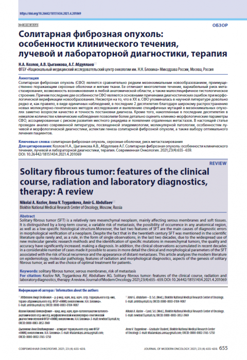 Козлов Н.А., Цыганкова А.В., Абдуллаев А.Г. Солитарная фиброзная опухоль: особенности клинического течения, лучевой и лабораторной диагностики, терапия. Современная Онкология. 2021;23(4):655–659.