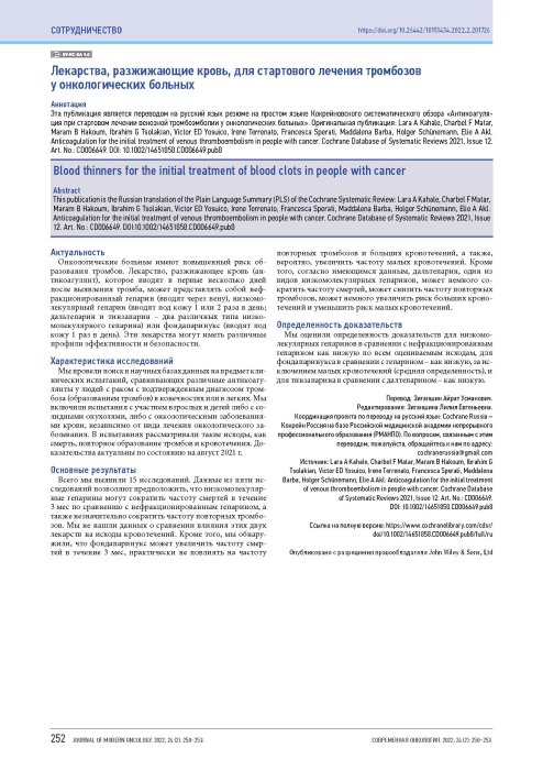 Эта публикация является переводом на русский язык резюме на простом языке Кокрейновского систематического обзора «Антикоагуляция при стартовом лечении венозной тромбоэмболии у онкологических больных». Оригинальная публикация: Lara A Kahale, Charbel F Matar, Maram B Hakoum, Ibrahim G Tsolakian, Victor ED Yosuico, Irene Terrenato, Francesca Sperati, Maddalena Barba, Holger Schünemann, Elie A Akl. Anticoagulation for the initial treatment of venous thromboembolism in people with cancer. Cochrane Database of Systematic Reviews 2021, Issue 12. Art. No.: CD006649. DOI: 10.1002/14651858.CD006649.pub8