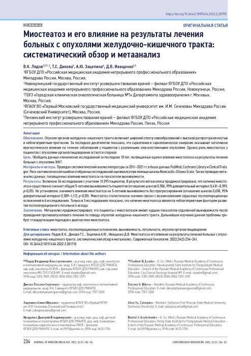 Лядов В.К., Дикова Т.С., Зацепина А.Ю., Иващенко Д.В. Миостеатоз и его влияние на результаты лечения больных с опухолями желудочно-кишечного тракта: систематический обзор и метаанализ. Современная Онкология. 2022;24(2):234–241. DOI: 10.26442/18151434.2022.2.201710