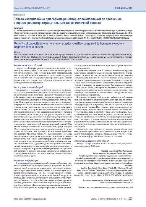 Эта публикация является переводом на русский язык резюме на простом языке Кокрейновского систематического обзора «Сравнение капецитабина при гормон-рецептор-положительном и гормон-рецептор-отрицательном раке молочной железы». Оригинальная публикация: Siao-Nge Hoon, Peter K H Lau, Alison M White, Max K Bulsara, Patricia D Banks, Andrew D Redfern. Capecitabine for hormone receptor-positive versus hormone receptor-negative breast cancer. Cochrane Database of Systematic Reviews 2021, Issue 5. Art. No.: CD011220. DOI: 10.1002/14651858.CD011220.pub2