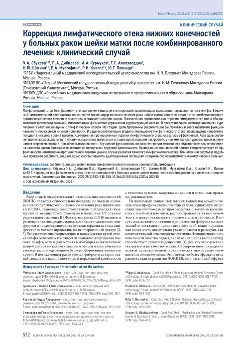Обухова О. А., Дибирова П. А., Курмуков И. А., Аллахвердян Г. С., Шагина Н. Ю., Мустафина Е. А., Князев Р. И., Паяниди Ю. Г. Коррекция лимфатического отека нижних конечностей у больных раком шейки матки после комбинированного лечения: клинический случай. Современная Онкология. 2023;25(4):532–538.
