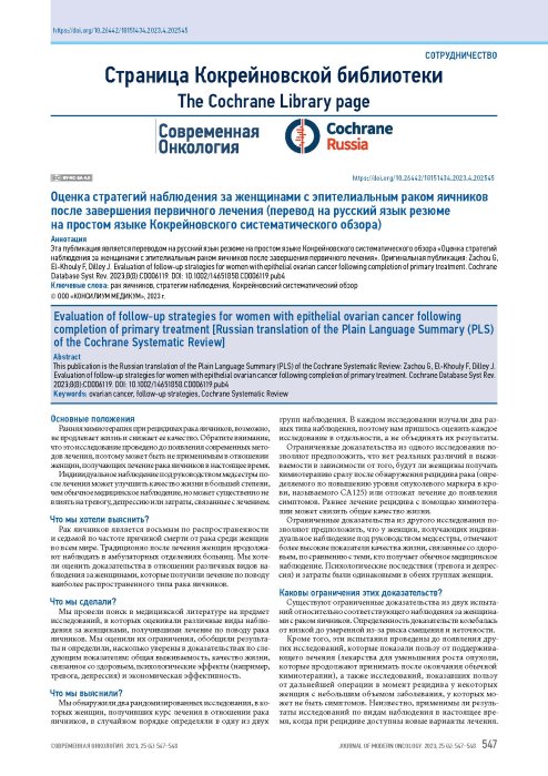 Оценка стратегий наблюдения за женщинами с эпителиальным раком яичников после завершения первичного лечения (перевод на русский язык резюме на простом языке Кокрейновского систематического обзора)