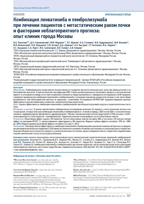 Покатаев И.А., Строяковский Д.Л., Федянин М.Ю., Жукова Л.Г., Стативко О.А., Андреяшкина И.И., Волкова М.И., Волконский М.В., Польшина Н.И., Котова Е.В., Кравчук Д.А., Быстров А.А., Антонова Т.Г., Лядова М.А., Кузьмина Е.С., Партс С.А., Салпагаров М.Х., Галкин В.Н., Климов А.В. Комбинация ленватиниба и пембролизумаба при лечении пациентов с метастатическим раком почки и факторами неблагоприятного прогноза: опыт клиник города Москвы. Современная Онкология. 2024;26(3):367–373.