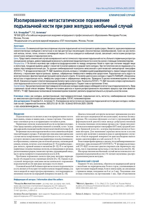 Огнерубов Н.А., Антипова Т.С. Изолированное метастатическое поражение подъязычной кости при раке желудка: необычный случай. Современная Онкология. 2025;27(1):32–35. DOI: 10.26442/18151434.2025.1.203198