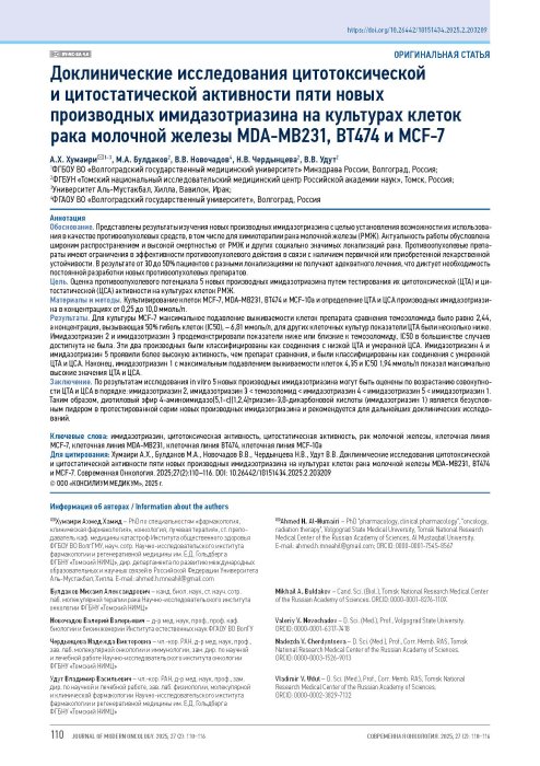 Хумаири A.Х., Булдаков М.А., Новочадов В.В., Чердынцева Н.В., Удут В.В. Доклинические исследования цитотоксической и цитостатической активности пяти новых производных имидазотриазина на культурах клеток рака молочной железы MDA-MB231, BT474 и MCF-7. Современная Онкология. 2025;27(2):110–116. DOI: 10.26442/18151434.2025.2.203209