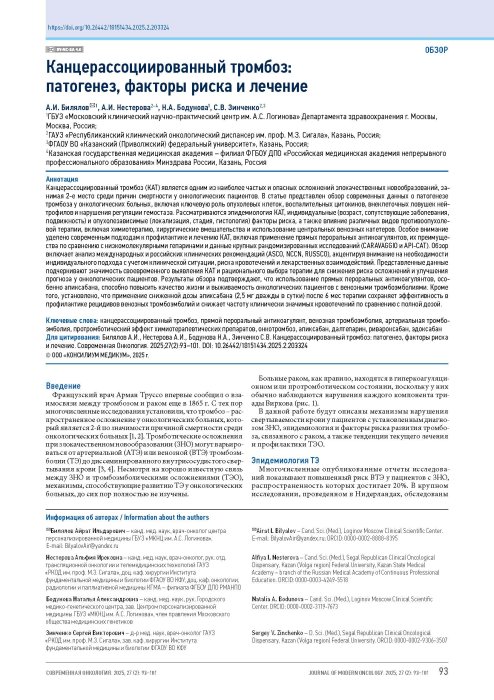 Билялов А.И., Нестерова А.И., Бодунова Н.А., Зинченко С.В. Канцерассоциированный тромбоз: патогенез, факторы риска и лечение. Современная Онкология. 2025;27(2):93–101. DOI: 10.26442/18151434.2025.2.203324