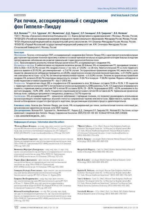 Волкова М.И., Турупаев К.А., Филиппова М.Г., Ладыко Д.Д., Синицына О.Р., Гриднева Я.В., Матвеев В.Б. Рак почки, ассоциированный с синдромом фон Гиппеля–Линдау. Современная Онкология. 2025;27(2):122–128. DOI: 10.26442/18151434.2025.2.203226