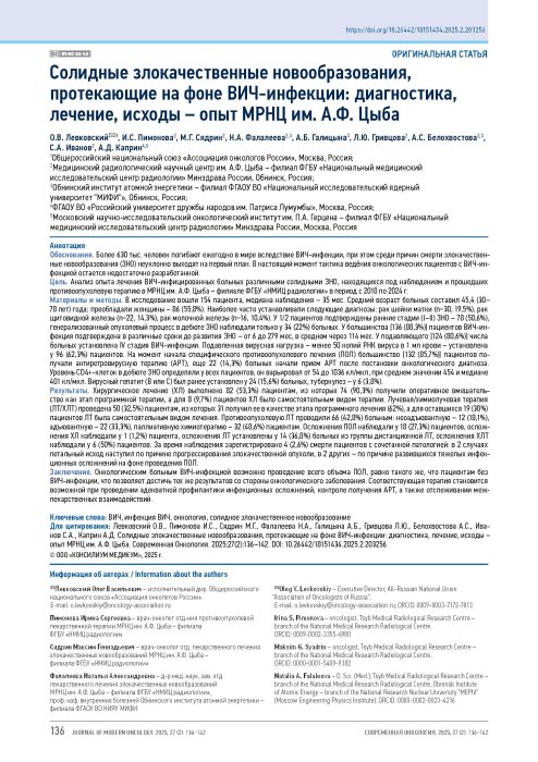 Левковский О.В., Пимонова И.С., Сядрин М.Г., Фалалеева Н.А., Галицына А.Б., Гривцова Л.Ю., Белохвостова А.С., Иванов С.А., Каприн А.Д. Солидные злокачественные новообразования, протекающие на фоне ВИЧ-инфекции: диагностика, лечение, исходы – опыт МРНЦ им. А.Ф. Цыба. Современная Онкология. 2025;27(2):136–142. DOI: 10.26442/18151434.2025.2.203256