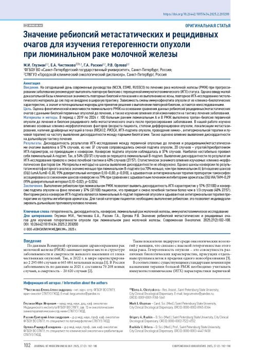 Глузман М.И., Чистякова Е.А., Раскин Г.А., Орлова Р.В. Значение ребиопсий метастатических и рецидивных очагов для изучения гетерогенности опухоли при люминальном раке молочной железы. Современная Онкология. 2025;27(2):102–108. DOI: 10.26442/18151434.2025.2.203200