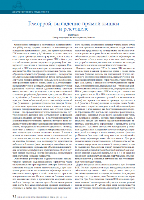 В.Л.Ривкин. Геморрой, выпадение прямой кишки и ректоцеле. Справочник поликлинического врача. 2010; 5: 72–73.