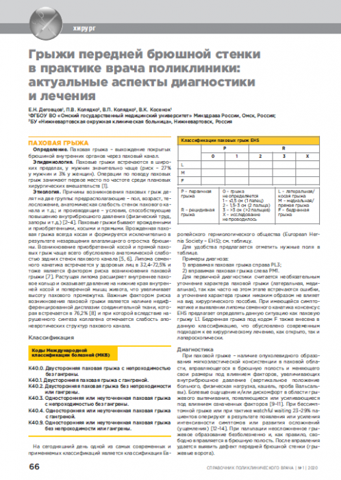 Е.Н. Деговцов, П.В. Колядко, В.П. Колядко, В.К. Косенок. Грыжи передней брюшной стенки в практике врача поликлиники: актуальные аспекты диагностики и лечения. Справочник поликлинического врача. 2020; 1: 66–70.