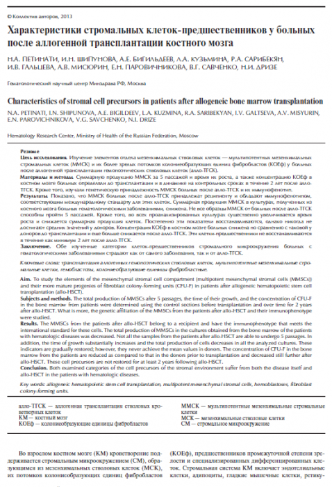 Результаты. Показано, что ММСК больных после алло-ТГСК принадлежат реципиенту и обладают иммунофенотипом, соответствующим международному стандарту для этих клеток. Суммарная продукция ММСК в культурах, полученных из костного мозга больных гематологическими заболеваниями, снижена. Не все образцы ММСК от больных после алло-ТГСК способны пройти 5 пассажей. Кроме того, во всех проанализированных культурах существенно увеличивается время роста и снижается суммарная продукция клеток. Постепенно эти показатели восстанавливаются, однако никогда не достигают средних значений у доноров. Концентрация КОЕф в костном мозге больных снижена по сравнению с таковой у доноров до трансплантации и еще больше снижается после алло-ТГСК. Эти клетки-предшественники не восстанавливаются в течение как минимум 2 лет после алло-ТГСК.