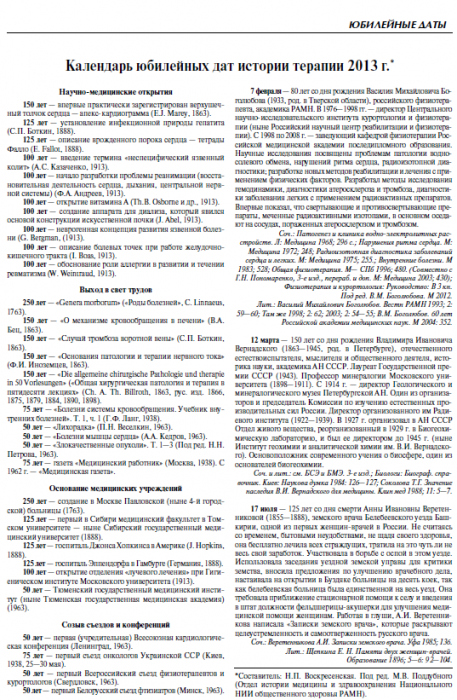 Календарь юбилейных дат истории терапии 2013 г. - Журнал Терапевтический архив №4 Вопросы диагностики внутренних болезней 2013