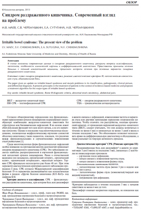 Маев И.В., Черемушкин С.В., Сутугина Е.А., Черемушкина Н.В. Синдром раздраженного кишечника. Современный взгляд на проблему. Терапевтический архив (архив до 2018 г.). 2013;85(8):95-100.