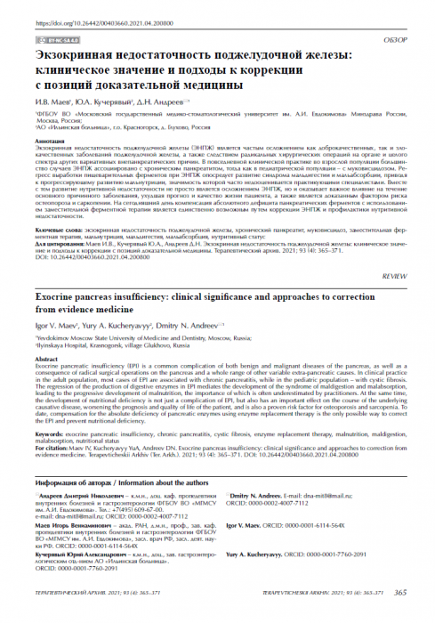 Маев И.В., Кучерявый Ю.А., Андреев Д.Н. Экзокринная недостаточность поджелудочной железы: клиническое значение и подходы к коррекции с позиций доказательной медицины. Терапевтический архив. 2021; 93 (4): 509–515. DOI: 10.26442/00403660.2021.04.200800