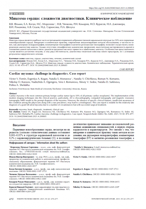 Фомин В.В., Коган Е.А., Морозова Н.С., Чичкова Н.В., Комаров Р.Н., Курасов Н.О., Дженжера Н.А., Романова В.И., Седов А.В., Саркисова Н.Д., Шелуха П.А. Миксома сердца: сложности диагностики. Клиническое наблюдение. Терапевтический архив. 2021; 93 (4): 470–477. DOI: 10.26442/00403660.2021.4.200685