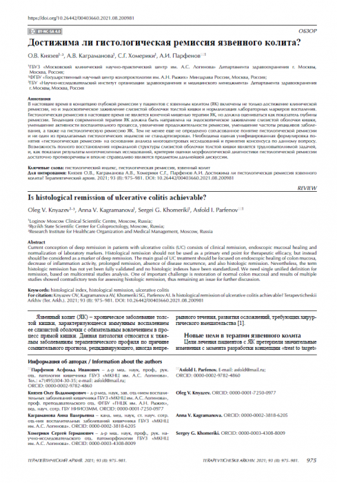 Князев О.В., Каграманова А.В., Хомерики С.Г., Парфенов А.И. Достижима ли гистологическая ремиссия язвенного колита? Терапевтический архив. 2021; 93 (8): 975–981. DOI: 10.26442/00403660.2021.08.200981