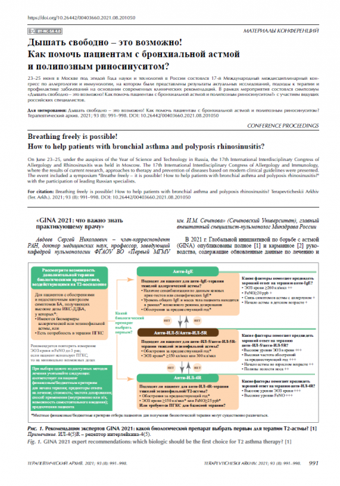 Дышать свободно – это возможно! Как помочь пациентам с бронхиальной астмой и полипозным риносинуситом? Терапевтический архив. 2021; 93 (8): 991–998. DOI: 10.26442/00403660.2021.08.201050