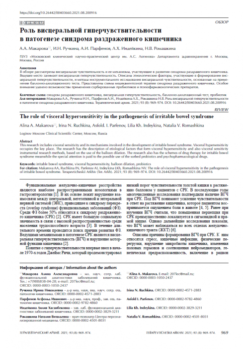 Макарова А.А., Ручкина И.Н., Парфенов А.И., Индейкина Л.Х., Ромашкина Н.В. Роль висцеральной гиперчувствительности в патогенезе синдрома раздраженного кишечника. Терапевтический архив. 2021; 93 (8): 969–974. DOI: 10.26442/00403660.2021.08.200916
