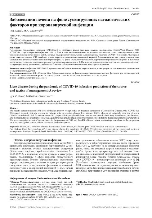 Маев И.В., Осадчук М.А. Заболевания печени на фоне суммирующих патологических факторов при коронавирусной инфекции. Терапевтический архив. 2022;94(11):1326–1332.