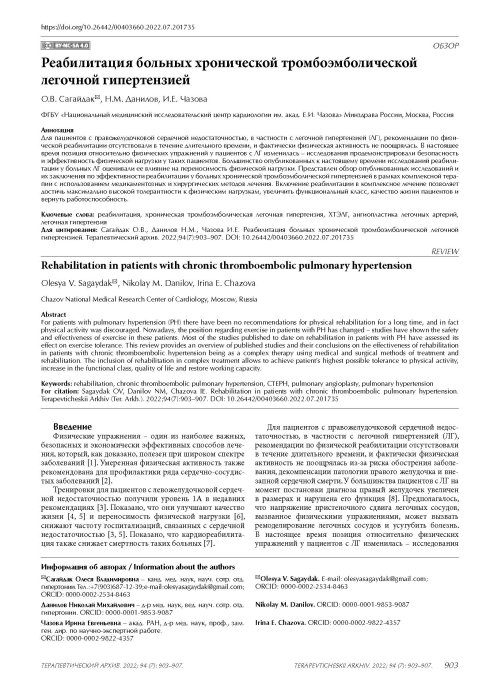 Сагайдак О.В., Данилов Н.М., Чазова И.Е. Реабилитация больных хронической тромбоэмболической легочной гипертензией. Терапевтический архив. 2022;94(7):903–907.