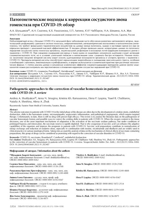 Шульдяков А.А., Смагина А.Н., Рамазанова К.Х., Ляпина Е.П., Чаббаров Ю.Р., Шешина Н.А., Жук А.А. Патогенетические подходы к коррекции сосудистого звена гомеостаза при COVID-19: обзор. Терапевтический архив. 2023;95(11):1004–1008. DOI: 10.26442/00403660.2023.11.202487