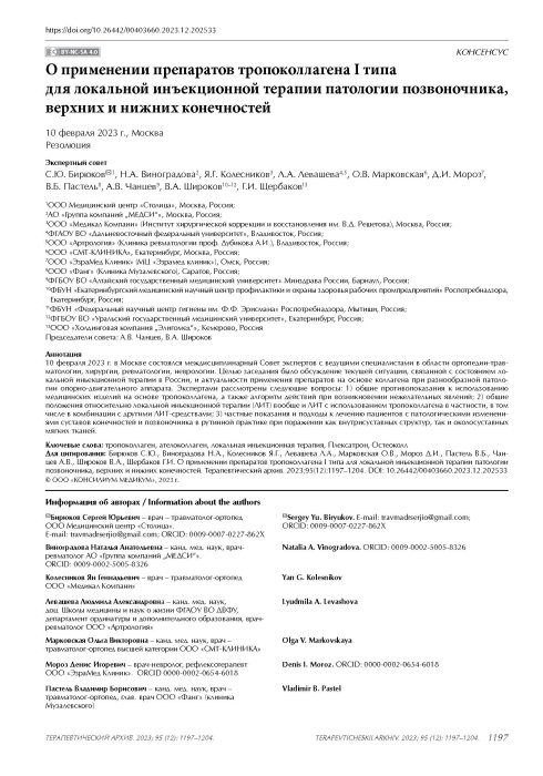 О применении препаратов тропоколлагена I типа для локальной инъекционной терапии патологии позвоночника, верхних и нижних конечностей - Журнал Терапевтический архив №12 Vario 2023
