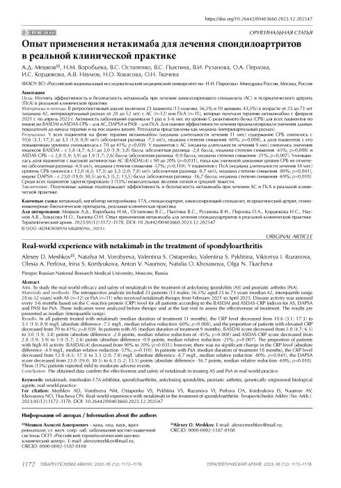Мешков А.Д., Воробьева Н.М., Остапенко В.С., Пыхтина В.С., Рузанова В.И., Перлова О.А., Кордюкова И.С., Наумов А.В., Ховасова Н.О., Ткачева О.Н. Опыт применения нетакимаба для лечения спондилоартритов в реальной клинической практике. Терапевтический архив. 2023;95(12):1172–1178.