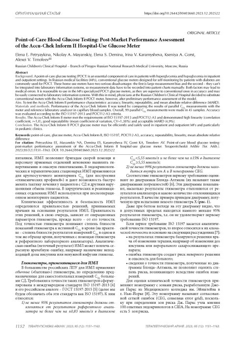 Петряйкина Е.Е., Маянский Н.А., Дёмина Е.С., Карамышева И.В., Горст К.А., Тимофеев А.В. Измерения глюкозы по месту лечения: пострегистрационное испытание госпитального глюкометра Акку-Чек Информ II. Терапевтический архив. 2023;95(12):1151–1163. DOI: 10.26442/00403660.2023.12.202522