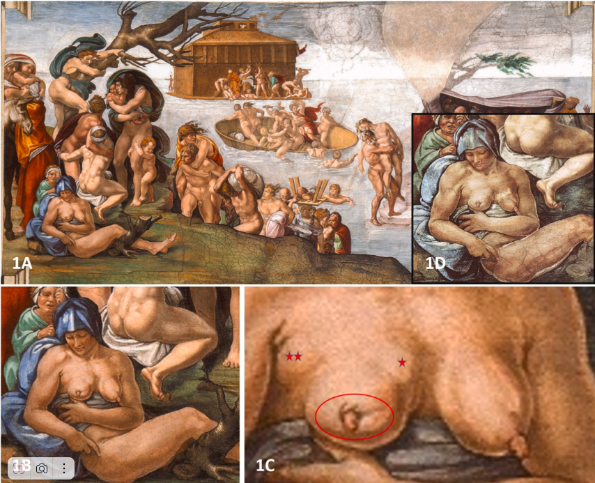 Международная группа экспертов, специализирующихся в разных областях медицины, антропологии и искусствоведения, опубликовала в журнале «The Breast» статью, анализирующую один из фрагментов фрески Микеланджело, расположенном на своде Сикстинской капеллы в Ватикане. Авторы предполагают, что в сцене «Потоп» изображена женщина с патологией груди, предположительно раком молочной железы.